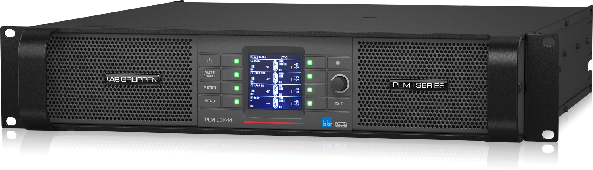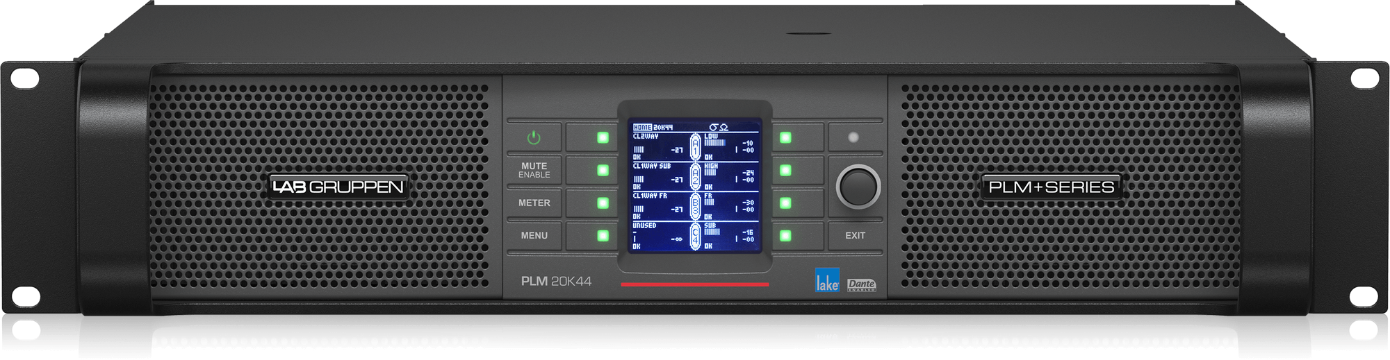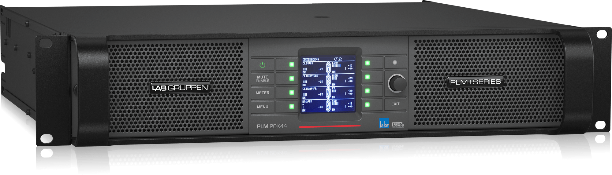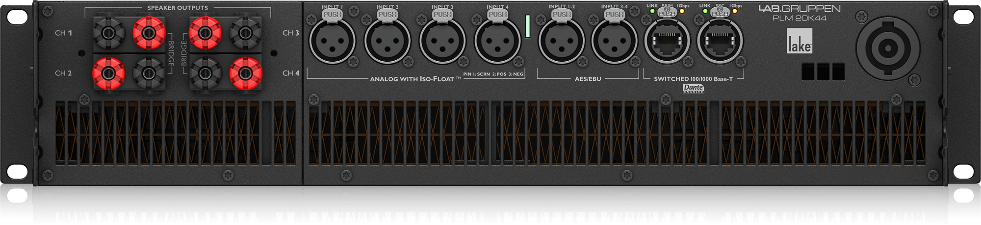 20,000W Amplifier with 4 Flexible Output-Channels on Binding Post Connectors, Lake Digital Signal Processing and Digital Audio Networking for Touring Applications