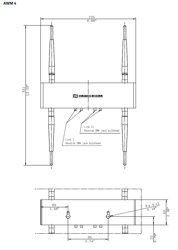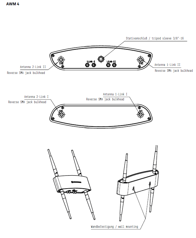 The wallmount antenna, consisting of four white rod antennas tuned to the 1.9 GHz frequency range and a rugged metal housing, shall be designed for unobtrusive antenna wall or tripod mount applications. The metal housing shall have four connectors for attaching the rod antennas to the top and bottom and shall provide a 3/8" internal thread at the bottom for tripod attachment as well as two 9 mm (0.35") mounting holes at the rear for wall attachment. Integrated R-SMA sockets on the bottom side allow for a direct connection of the antenna cables, thus minimizing installation effort. The dimensions (W x D x H) shall be 225 x 53 x 60 mm (8.86" x 2.09" x 2.36"). Weight shall be 669 grams (23.6 oz). The color of the wallmount antenna shall be white. The wallmount antenna shall be the Sennheiser AWM 4. Suitable antenna cables in different lengths shall be available as accessories.