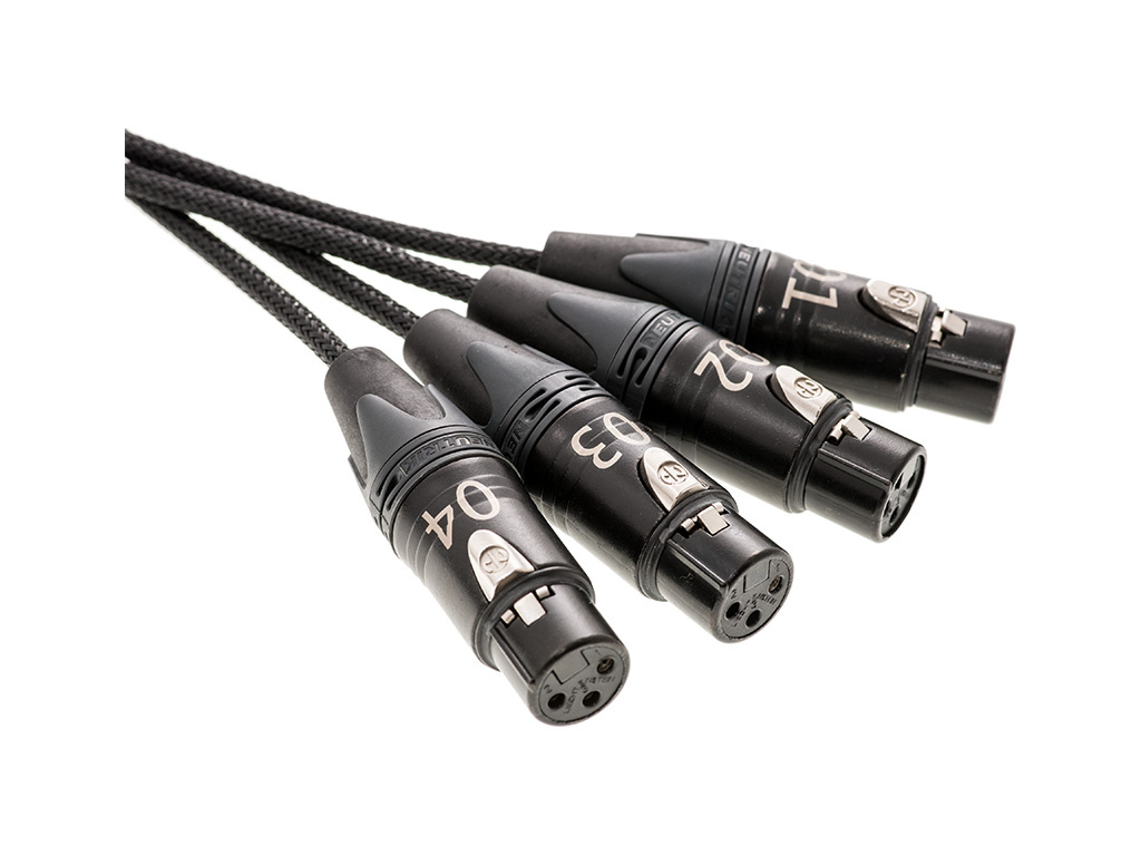 This is not its only advantage. Converter RJ45 is constructed from powder-coated black aluminum, making it blend in discreetly where it should not be visible. The engraved owner's logo and markings on the XLR connectors are very clear. Additionally, you have the option to label the channels with colored rings for easy identification. Durability is also a key feature of this product, as it is assembled with high-quality Neutrik connectors. The entire product is meticulously crafted to ensure reliable performance over many seasons.
