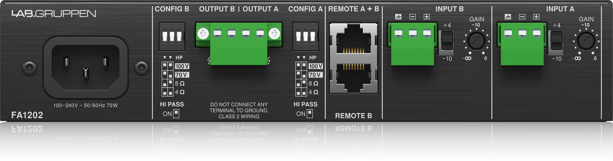 - Low-Z (4/8 Ohm) and High-Z (70/100 V) operation per output with switchable high-pass filter