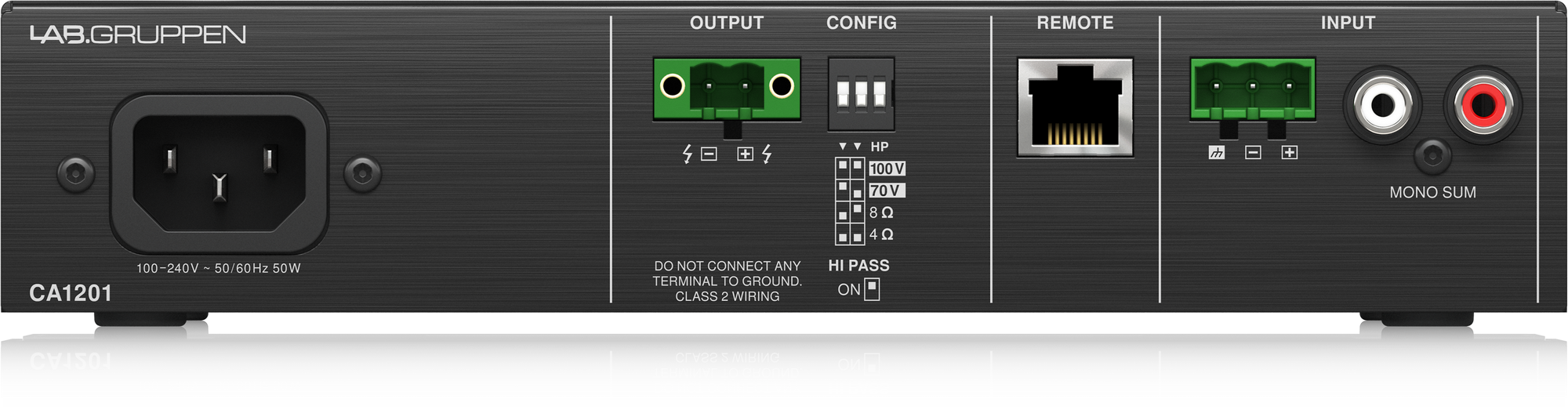 The Lab.Gruppen CA1201 is an amplifier for commercial installations. The easy interface makes it easy to use for everyone and in addition the amplifier is compact (1U rack format) and easy to hide during an installation. The CA1201 is a 1x 120 Watt amplifier with a direct drive for constant performance and reliability. At the rear of the amplifier there is an RJ-45 Ethernet connection for connecting a remote control.