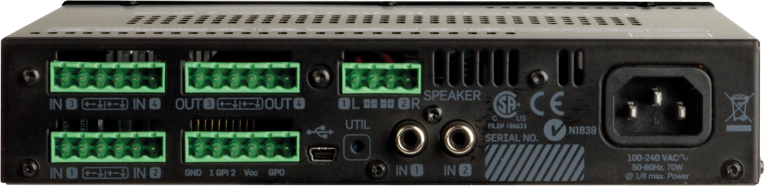 - 4 x 4 matrix allows mixing and routing all inputs to amplifier output channels and 2 balanced line level outputs