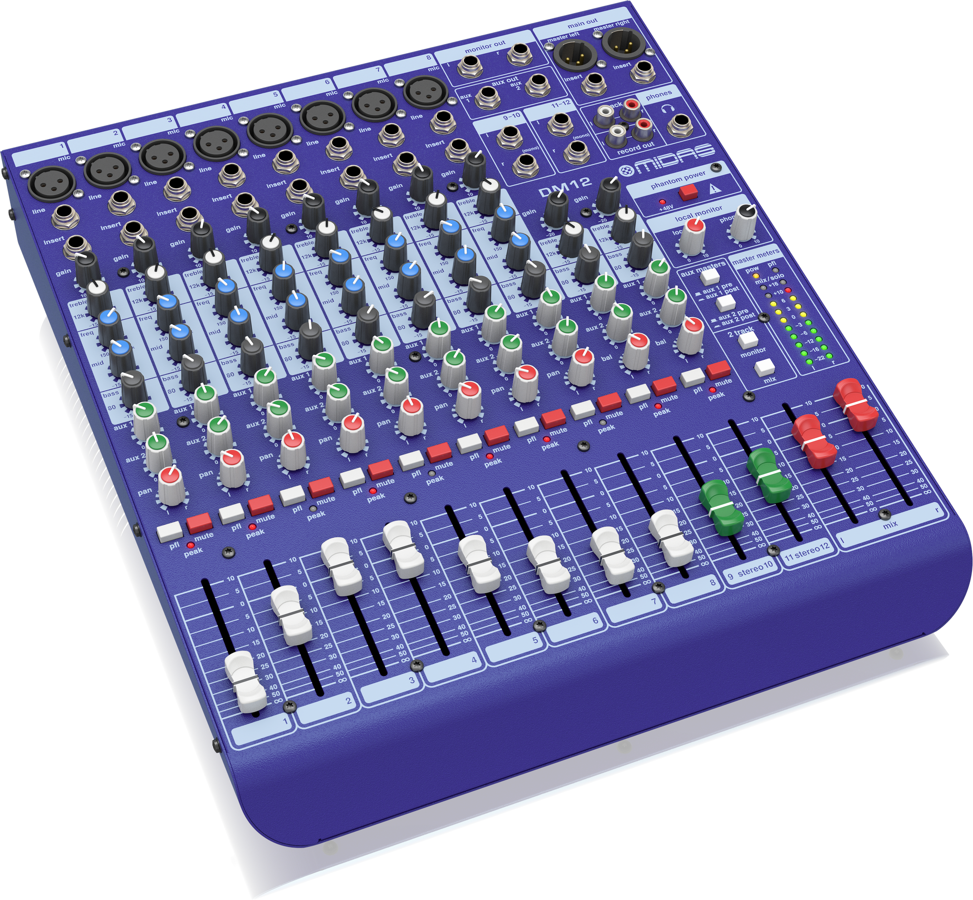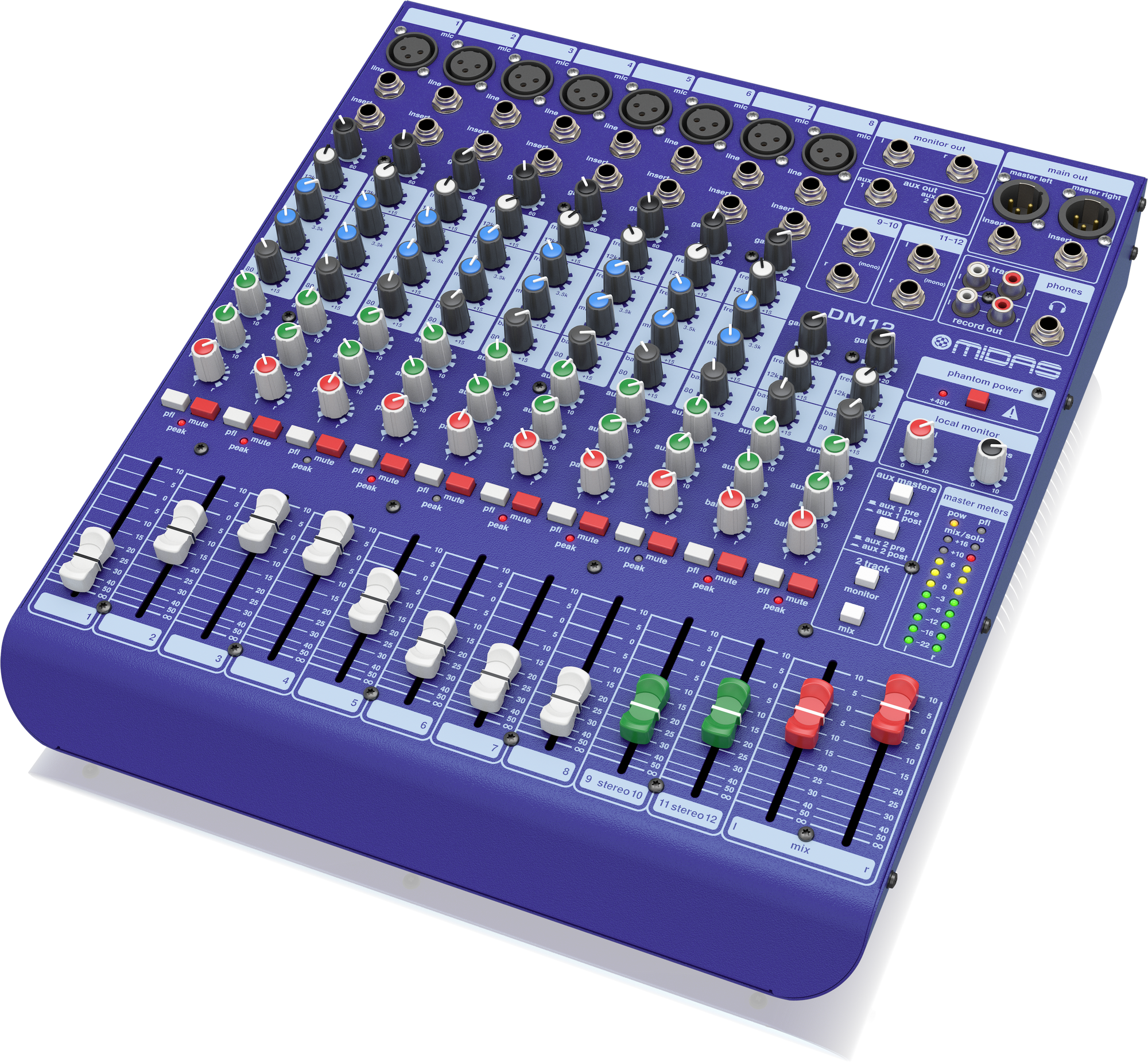 La qualité de fabrication renommée de Midas se retrouve également dans cette Midas DM12 avec son boîtier robuste, ses boutons et ses faders Midas. Connectez-le, par exemple, à un haut-parleur alimenté par Turbosound et vous avez terminé.