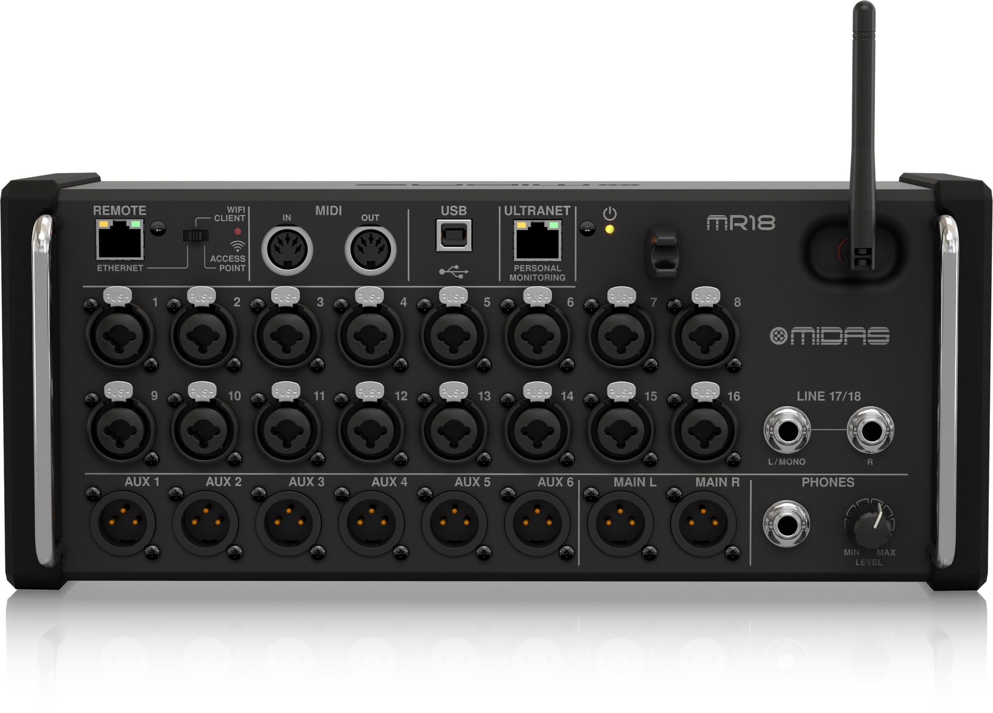 De 18 kanaals mixer is ook voorzien van 6 aux bussen, 4 FX return kanalen en 16 MIDI I/O's. Alle bussen zijn voorzien van inserts, full dynamics processing en 6-band parametric/ 31-band graphic EQs. De XLR/TRS kanalen op de MR18 zijn voorzien van Midas Pro Microphone preamps waarmee je de beste kwaliteit conversie behaald. De MR18 heeft ook 4 true stereo interne effect engines waarmee je gemakkelijk meer controle over je mix krijgt.