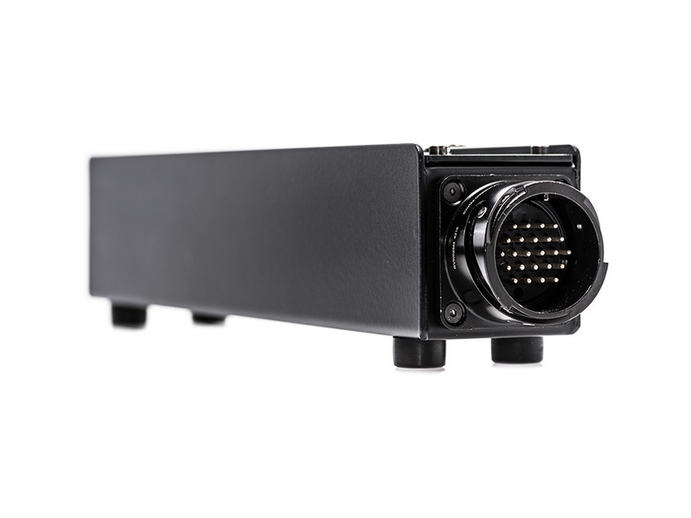 Stagebox with multicore connector and XLR connectors made of sturdy metal casing, providing protection against damage, while the panel is made of aluminum.