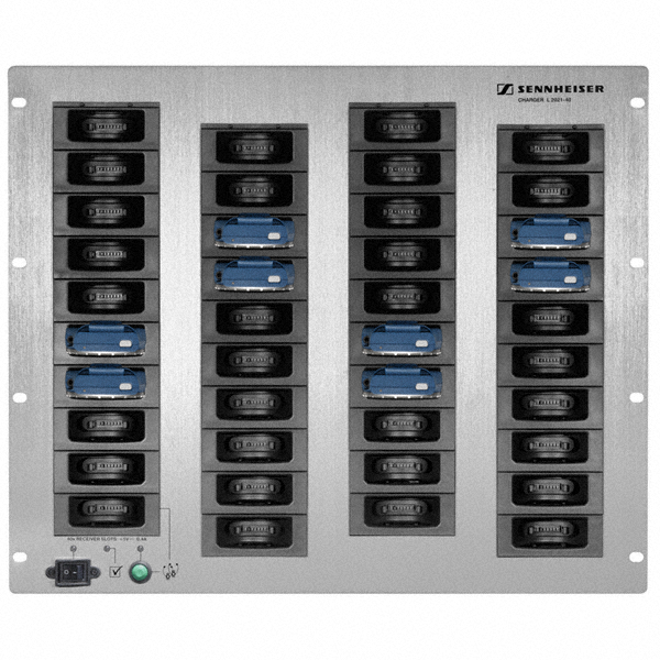 De L 2021-40 oplaadrek is speciaal ontworpen voor stationaire toepassingen. Het biedt plaats aan maximaal 40 receivers die automatisch snel worden opgeladen om klaar te zijn voor het volgende evenement. Tegelijkertijd dient de L 2021-40 als ethernet-interface om op een centrale PC vooraf het actieve kanaal voor elke receiver te selecteren. Er kunnen tot 125 oplaadrekken met maximaal 5000 receivers op de PC worden aangesloten. De CC 2021 besturingssoftware biedt eenvoudige presets om met één klik kanalen voor iedereen te selecteren en te bevestigen. Gebruikers en servicemedewerkers kunnen eenvoudig monitoren welke receivers op welk station zijn voorbereid voor een bepaalde taal of programma. Configuratieproblemen behoren tot het verleden!